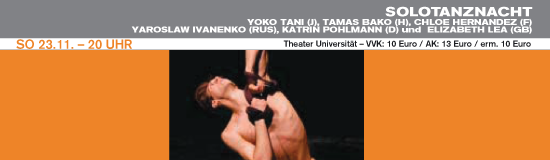 Diese Solotanznacht präsentiert die Gewinner und Finalisten des Internationalen Solo-Tanz-Theater-Festivals Stuttgart 2003. Sie zeigt herausragende junge TänzerInnen mit ihren aktuellen Produktionen und bietet gleichzeitig einen spannenden Überblick über die neuesten Entwicklungen der internationalen Solo-Tanzszene.