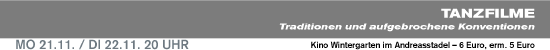 Der Regensburger Kulturmonat November bietet alljährlich zwei absolute Highlights: die REGENSBURGER KURZFILMWOCHE und die REGENSBURGER TANZTAGE. Um die künstlerischen Ausdrucksformen Tanz und Film auf gebührende Weise zusammenzubringen, präsentiert die KURZFILMWOCHE heuer erstmals zwei Programme mit Tanzfilmen: Kurze Werke zwischen dem traditionellen und einem experimentellen Verständnis von Tanz und Film, zwischen Dokumentarfilm, Performance, Videokunst und Avantgarde. Exempel, nicht nur die Ästhetik und Bewegung des Körpers in wunderbare Bilder gefasst zu zeigen, sondern auch Veränderungen der Körperwahrnehmung zu vermitteln. Tanzfilme – ebenso ein Versuch, den Spagat zur Populärkultur zu wagen, wie mit Musikvideos, welche die beiden Formen Tanz und Film massenwirksam vereinen wollen. Zwei Programme zwischen Traditionen und aufgebrochenen Konventionen zweier Kunstformen – für Cineasten und Liebhaber des Tanzes gleichermaßen konzipiert.