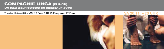 Eine der spannendsten internationalen Produktionen des Jahres kommt von der COMPAGNIE LINGA aus Lausanne. Inspiriert vom Werk des Schriftstellers und Philosophen Italo Calvino gehen die international mehrfach ausgezeichneten Choreografen Katarzyna Gdaniek und Marco Cantalupo in ihrem Stück "Un train peut toujours en cacher un autre (Ein Zug kann immer einen anderen verstecken)" der Frage nach, wie verschiedene Menschen die Realität wahrnehmen können. In neun Bildern/Szenen führen die Tänzerinnen und Tänzer der Compagnie das Publikum auf witzige, tiefgründige Weise hinters Licht und lassen es an der Realität des Wahrgenommenen zweifeln. Früher oder später fragt sich jeder, ob das, was er glaubt zu sehen, das ist, was wirklich passiert und inwieweit seine Art des Wahrnehmens die Wirklichkeit verzerrt.