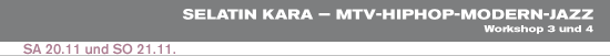 Neben seiner Mitwirkung in zahlreichen MTV-Clips und Filmproduktionen ist SELATIN KARA ein international gefragter Tänzer, Choreograf und aufgrund seiner pädagogischen Fähigkeiten auch ein beliebter Dozent, der mit seiner sympathischen Art die pure Leidenschaft am Tanz, kombiniert mit Technik und Erfahrung "ohne Starallüren" sowohl Anfängern wie Fortgeschrittenen und Profis gleichermaßen einfühlsam vermitteln kann. SELATIN KARA zeigt in seiner ganz persönlichen Art Wege zu erfolgreichem und kreativem Tanzen auf. In seinen beiden Workshops bietet er das gesamte Spektrum tänzerischer Ausdrucksformen der modernen Tanzrichtungen von MTV über HipHop und Modern bis Jazz Dance.
