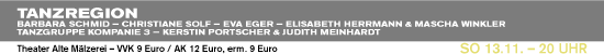 TANZGRUPPE KOMPANIE 3 "DEGA" – Vier Körper zeigen Tanz – möchten auch Gesicht zeigen – tun sie aber nicht. ELISABETH HERRMANN & MASCHA WINKLER "Zeitfenster" – Leben im Fluss der Zeit. Zwei Frauen bewegen sich zwischen gestern und heute. KERSTIN PORTSCHER & JUDITH MEINHARDT "Allerleirauh" – Märchen bieten unterschiedliche Zugangsmöglichkeiten. Die Märchenerzählung selbst, psychologische Deutungen sowie die tänzerische Darstellung laden dazu ein, die Symbolkraft des Märchens mit allen Sinnen zu erleben.