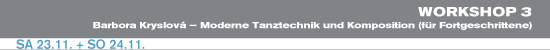 Der Workshop beginnt mit einem modernen Training, das eigene tänzerische Erfahrungen mit unterschiedlichen Techniken wie Graham, Limon und Cunningham verbindet. Das Training entwickelt sich über ein langsames warm-up zu Übungen zur Stärkung der Fuß- und Beintechnik, sowie der Geschmeidigkeit und Durchlässigkeit des Körpers, bis hin zu Sequenzen in der Mitte. Diese werden dann im Raum weiterentwickelt, mit Elementen des Fallens und der Bodenarbeit ergänzt oder zu technischen Sprungsequenzen gesteigert. Im zweiten Teil wird die Dozentin mit kurzen Bewegungssequenzen Möglichkeiten der Komposition in Bezug auf Raum und Zeit erläutern und an Auszügen aus ihren Choreographien arbeiten. Ziel des Workshops ist es, sich der Tanztechnik zu bedienen ohne sie dabei in den Vordergrund zu stellen, seinen gesamten Körper wahrzunehmen, den Mut haben sich fallen zu lassen und die Fertigkeit sich wieder aufzufangen, durch Bewegungen an die eigenen Grenzen zu gelangen ohne je die Kontrolle zu verlieren.