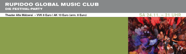 Fernab aller konventionellen Party-Konzepte und passend zum interkulturellen Charakter des Festivals bietet der RUPIDOO GLOBAL MUSIC CLUB die besondere Mischung aus Weltmusik und Clubkultur, wie sie aktuell in allen Großstädten Europas angesagt ist. Begeisterte Musikfans lassen sich mitreißen und tanzen zu Ethnoklängen mit Clubcharakter: treibende Balkan-Beats, griechische Pop-Perlen, ausgewählter Arabic-Pop, Afrohouse und grooviger Latin, gepaart mit zeitgenössischem Clubsound, HipHop und Dancehall. Die Musikauswahl der DJs bringt die Tanzflächen zum Kochen und macht die Veranstaltung zu einer der außergewöhnlichsten Clubnächte in der Stadt. Im GLOBAL MUSIC CLUB tanzen alle. Jeder der mitfeiern will, ist willkommen.