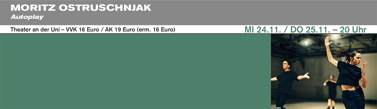 Sein neues Werk ist ein Tanz-Mashup, ein Bastard-Pop aus 1000 Diebstählen: In „Autoplay“ wird die copy & paste-Taste zum Leitmotiv. Jede Bewegung, jeder Ton, jedes Bild ist ein „objet trouvé“ aus dem World Wide Web. Von zeitgenössischer Choreografie bis zum „Harlem Shake“, vom Videogame „Fortnite“ bis zur Shampoo-Werbung, vom Selfie-Style bis zur global vermarkteten Pose von Michelangelos David – alles wird neu kombiniert, reorganisiert und gemixt. Moritz Ostruschnjak schickt das Publikum in einen Raum aus Hyperlinks, die zu einem Bild des (digitalen) Daseins im 21. Jahrhundert verschmelzen. Utopie und Konsumterror, Subkultur und Populismus sind dabei immer nur einen Klick voneinander entfernt. „Autoplay“ bringt die Chancen und Schattenseiten des digitalen Zeitalters verführerisch und aufreibend auf den Punkt. „Großartig!“ (Süddeutsche Zeitung)