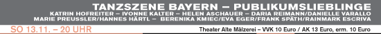 Unter TANZSZENE BAYERN - PUBLIKUMSLIEBLINGE ist eine Auswahl herausragender junger Tänzer und Choreografen aus Bayern zu erleben, die sich bereits auf hochrangigen Veranstaltungen profilieren konnten. KATRIN HOFREITER erzählt in ihrem neuen Stück "Ah! Non Credea mirarti" in klaren einfachen Bildern von der Unvernunft der Menschen und gedenkt derer die daran glauben müssen. Das von IVONNE KALTER getanzte Solo "Into our larger selves" (Choreografie: Minka-Marie Heiß) handelt vom Fliegen und vom Träumen, und den Fragen nach innerer und äußerer Identität.