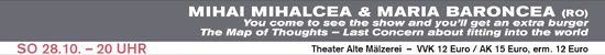 MARIA BARONCEA gehört bereits zur nächsten Generation dieser aufstrebenden Szene rund um das National Dance Center in Bukarest. In ihrer Soloperformance (unter)sucht MARIA BARONCEA Momente der Intimität und der Verwundbarkeit: Wann ist man wirklich ganz für sich? "The Map of Thoughts - Last Concern about fitting into the world" ist ein Kompendium der alltäglichen und unbewussten Bewegungen, eine Kartographie des Körpers. Ein Tanz für die Gedanken. Wie wäre es, so zu denken, auf diese Art und Weise, so wie Sie es bald sehen werden?" Nominiert bei der Balkan Dance Platform 2005 in Skopje, Mazedonien.