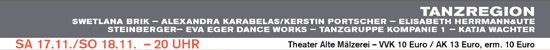 Kurzstücke, Ausschnitte, Premieren: TänzerInnen und ChoreografInnen aus Regensburg und der Region stellen ihre neuen Arbeiten vor: SWETLANA BRIK (Weiden) "Apokalypse" – Ein Tanzstück als Warnung an die Menschen. (3. Preis beim Wettbewerb "Das beste deutsche Tanzsolo" in Leipzig). ALEXANDRA KARABELAS/KERSTIN PORTSCHER (Regensburg/München) "Miniature" – Auseinandersetzungen mit Komponenten von Tanz. Tanz als Sprache und Ausdrucksmittel von Unsagbarem. ELISABETH HERRMANN & UTE STEINBER-GER (Regensburg) "Maria und die Callas" – Ein Duo über die widerstreitenden Persönlichkeiten der Maria Callas.