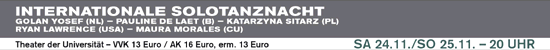 Die Solotanznacht präsentiert die Gewinner und Finalisten des Internationalen Solo-Tanz-Theater-Festivals Stuttgart 2007. Sie zeigt herausragende junge TänzerInnen mit ihren aktuellen Produktionen und bietet gleichzeitig einen spannenden Überblick über die neuesten Entwicklungen der internationalen Solo-Tanz-Theater-Szene. Das Solo-Tanz-Theater-Festival in Stuttgart ist einer der wichtigsten internationalen Wettbewerbe für zeitgenössische Choreografen und junge Tänzer. ChoreografInnen und TänzerInnen zeigen bei diesem Wettbewerb jeweils ein Solostück, das eine neue, originelle, phantasievolle und ungewöhnliche Leistung mit eigenem Stil bietet. Sowohl das choreografische und tänzerische Können als auch Dramaturgie, Musikalität und die Präsentation insgesamt werden beurteilt und prämiert.