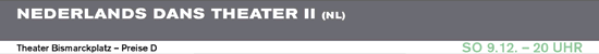 Abschluss und Höhepunkt der 10. REGENSBURGER TANZTAGE: Das NEDERLANDS DANS THEATER II. Die junge Compagnie aus sechzehn kraftvollen TänzerInnen im Alter bis zu 23 Jahren gilt international als eines der revolutionärsten Ensembles in der Welt des zeitgenössischen Tanzes. Ihre Technik ist verblüffend, ihre grenzenlose Energie versetzt das Publikum weltweit in Staunen. Anfangs als interne Trainingsklasse gedacht, ist es zu einem absoluten Weltklasse-Ensemble geworden. Bei den REGENSBURGER TANZTAGEN ist das NEDERLANDS DANS THEATER II mit neuen Werken der Choreografen Jiri Kylian und Hans van Manen zu erleben, die im November beim international renommierten Holland-Festival 2007 uraufgeführt werden.