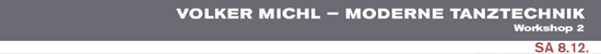 Die jahrelange Arbeit mit Rui Horta und der CobosMika.Company spiegelt sich in seinem Unterricht wider. In den verschiedensten Bewegungs-Levels finden sich Elemente des Release ebenso wie eine dynamische und energievolle on-off Balance Arbeit, deren Schwerpunkt sich vor allem auch auf die Qualität der Bewegung richtet. Die Arbeit am Boden, die eigene Platzierung, das Abgeben von Gewicht in den Boden und die permanenten Energiewechsel prägen den Unterricht. Schon das Warm up besteht nicht aus mechanischen Übungen, sondern ist in einer sehr tänzerischen Weise gestaltet. In der abschließenden Combination wird Wert auf den eigenen Ausdruck, die Intention der Bewegung und die musikalische Interpretation gelegt. Vorkenntnisse unbedingt erforderlich. Bitte Knieschoner mitbringen!