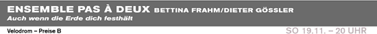 DIETER GÖSSLER etablierte seinen hervorragenden Ruf als Choreograf und Tanzdramatiker, nach einer erfolgreichen Tänzerkarriere, in über zehn Jahren als Ballettdirektor in Regensburg. Seit einigen Jahren lebt er in Paris und erforscht mit seiner Partnerin, der immer wieder hinreißenden BETTINA FRAHM, angemessene Ausdrucksformen jenseits der Danse d' école. "Wunderbarer Tanz, wunderbare Bilder. Frahm und Gössler enthusiastisch gefeiert." (Mittelbayerische Zeitung, 2005)